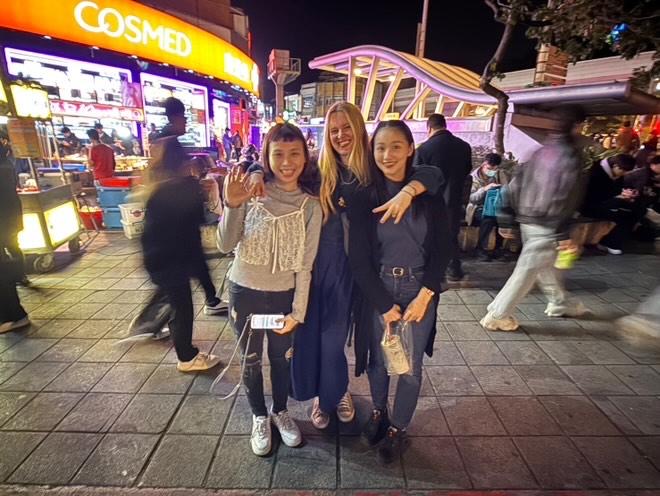 Den ersten Tag in Taipeh habe ich im Bett verbracht. Die Mischung aus Jetlag und Periodenschmerzen würde ich Niemanden für den Anfang einer Reise empfehlen. Einen Tag später geht es dafür wieder bergauf. Auf dem Shilin Food Night Market treffe ich meine alten Freunde aus Taiwan, Chocolate und Chiaoni, wieder. Zuletzt gesehen und kennengelernt haben wir uns vor sechs Jahren, im Sommer 2019, auf einem traditionellem Tanz- und Musikfestival in meiner Heimat. Als freiwillige Helferin betreute ich die Gruppe aus Taiwan; Chocolate und Chiaoni verbrachten eine Woche bei mir und meiner Familie. Am Tag ihrer Abreise erhielt ich die Einladung, sie in Taiwan besuchen zu kommen. „I promise I will come and visit you“ habe ich damals zu ihnen gesagt. Es hätte jedes Land der Welt sein können – und ich hätte trotzdem dasselbe gesagt. Das Versprechen löse ich nun endlich ein.