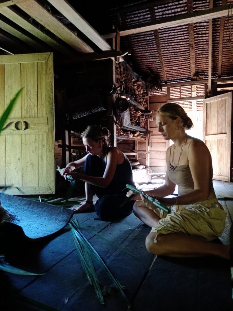 „Nama?“ fragt mich eine der beiden Frauen mit leiser Stimme und deutet mit dem Finger auf mein Becken. Wir stehen in der Küche der Urma und mir wird gerade aus Bananenblättern ein Rock geflochten, um damit fischen zu gehen, als die beiden mit der Neugier von Kindern von mir wissen wollen, wie das weibliche Geschlechtsteil auf meiner Sprache heißt. Wir tauschen unser Wissen aus, aber nicht bevor sie mich ermahnen, leise zu sprechen – ihre Männer sind nebenan. „Vulva“ ist es auf meiner Sprache – „Tile“ auf Mentawai.