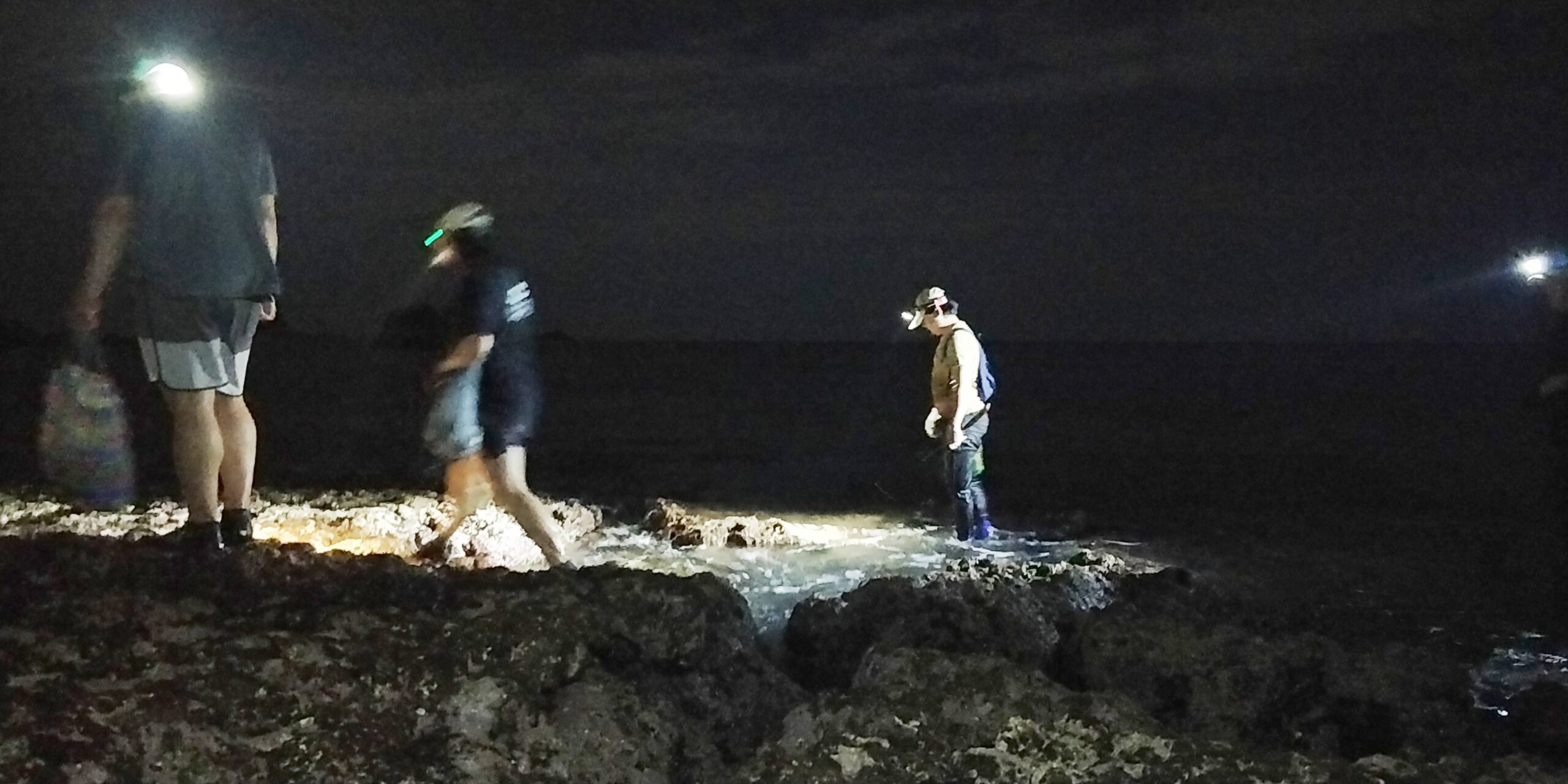 Mit Schwimmschuhen und Kopflampe ausgestattet, laufen wir zu fünft los. Obwohl der Vollmond zwischen dem dünnen, löchrigen Teppich aus Wolken hervorsticht, kann ich auf den spitzen Steinen des Riffs kaum zwei Meter vor mir sehen. Ich selber finde keine Muscheln oder andere Tiere. Stattdessen bleibe ich an jeder Steinspalte stehen und bewundere, wie sich die Wassermassen zwischen die Felsen drücken. Dabei entsteht jedes Mal ein zischendes Geräusch, das so klingt, als würde das Meer atmen. Möglicherweise durch Hohlräume oder platzende Blasen im Gestein.