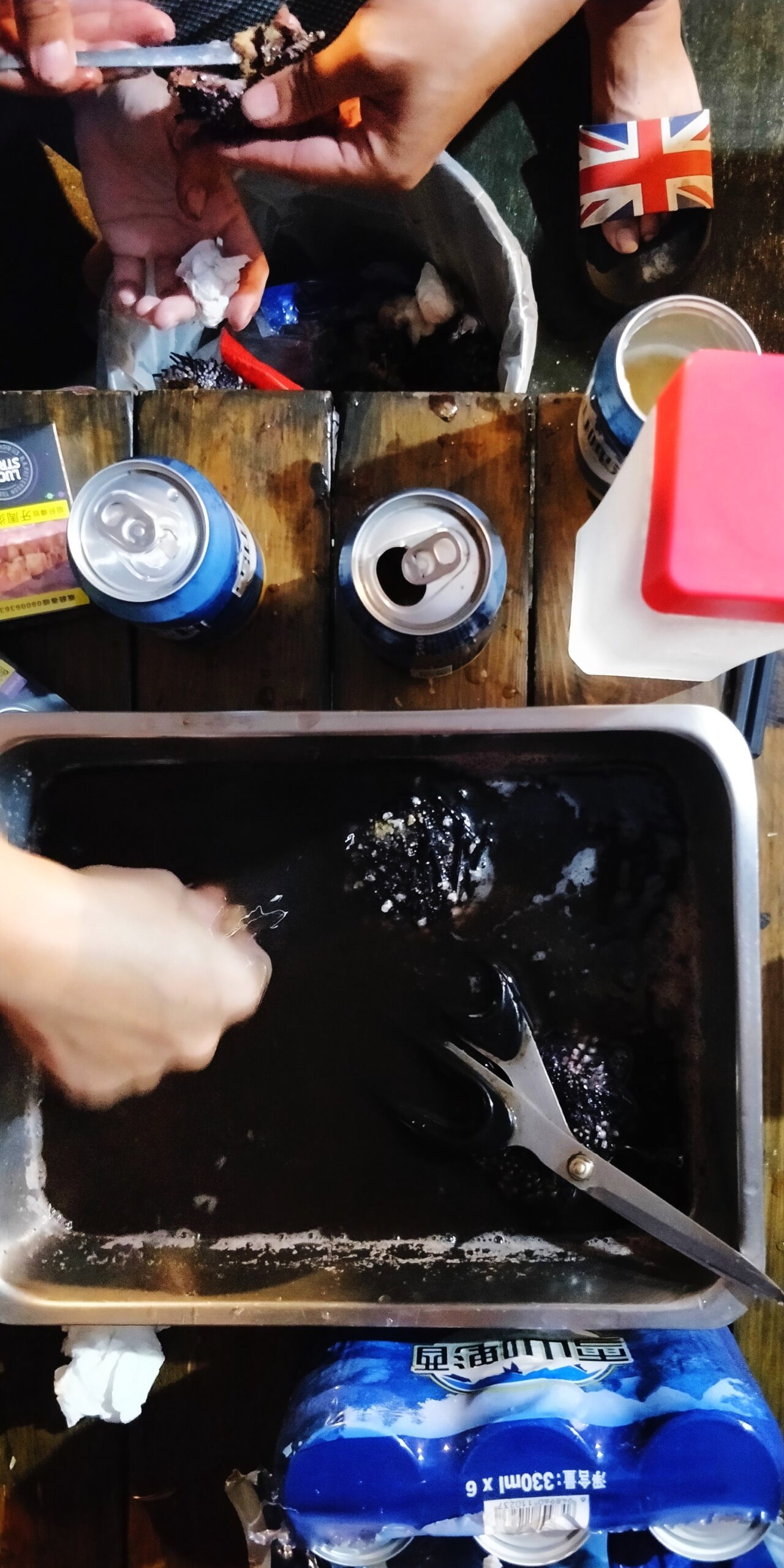 Zurück im Hostel gibt es mehr Bier und Zigaretten. Die Krebse und Seeigel werden mit einer Soße aus Sojasauce und Wasabi gegessen und, zugegeben, zusammen mit dem Bier schmeckt es lecker. Seeigel schmeckt salzig und überraschend zart.